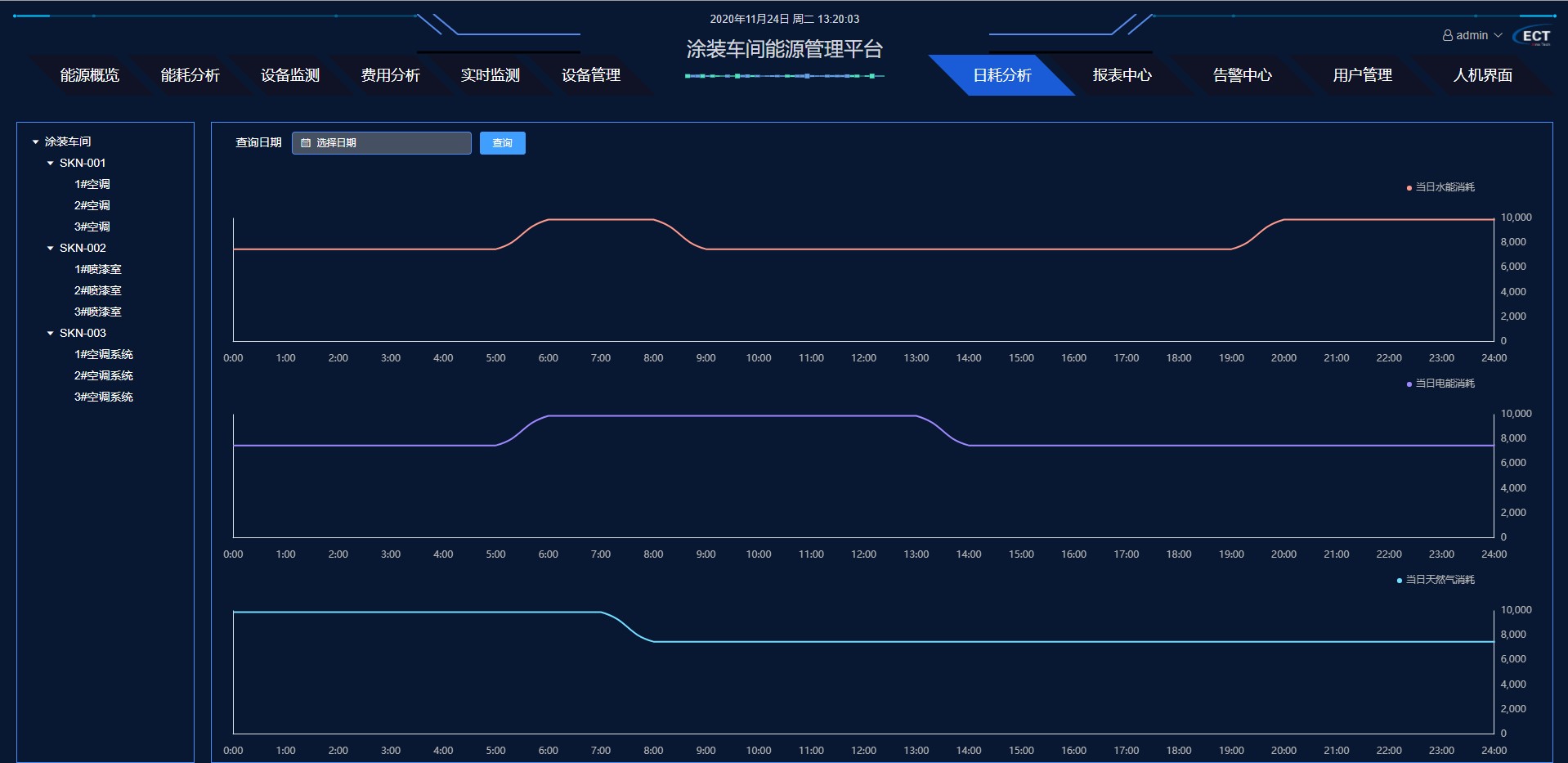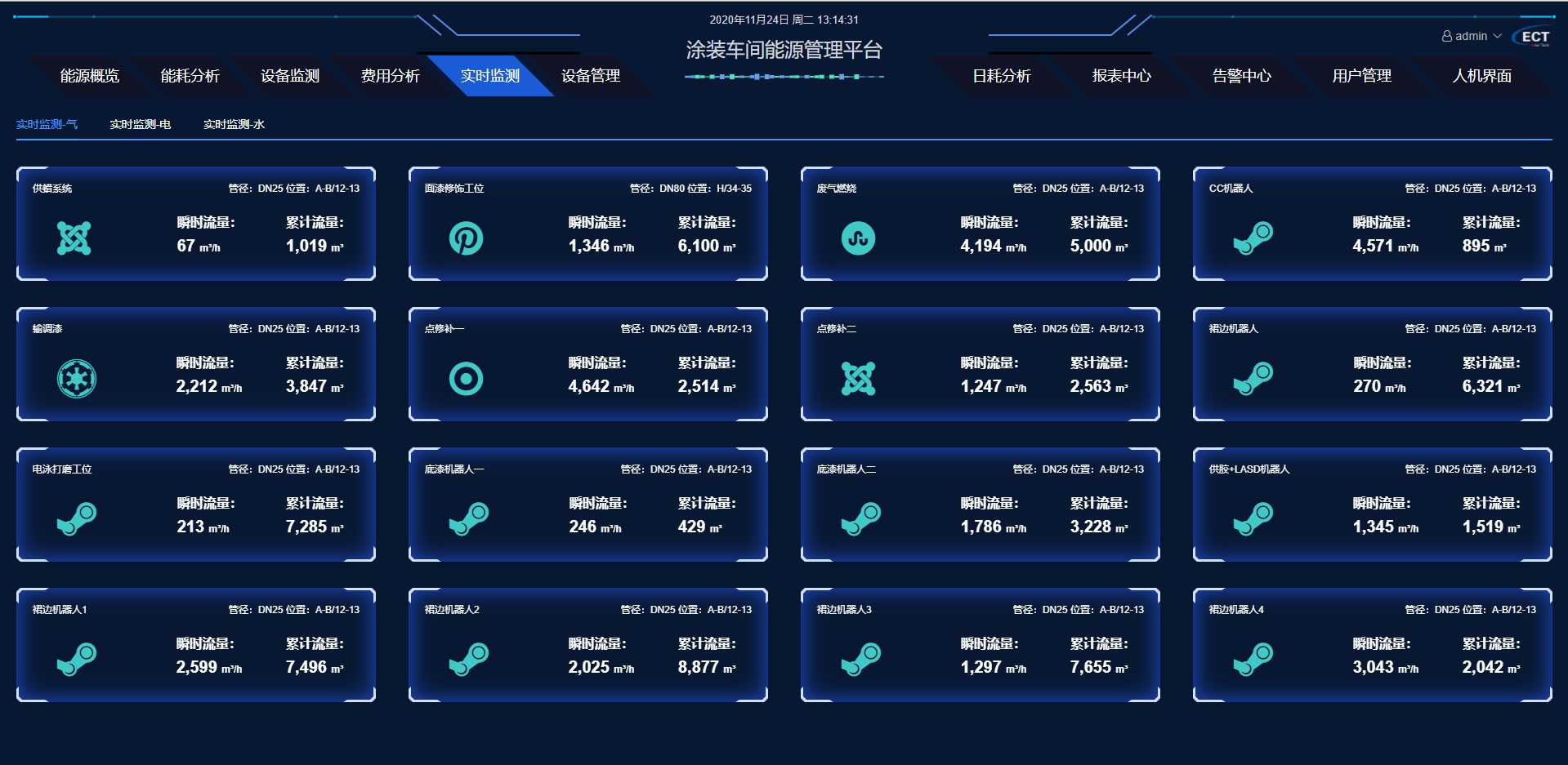 根据不同的关注点,用户可以看到自己管辖区域各种能源分系统、分区域的的实时、历史数据,能源利用情况,计划、耗能定额、实际耗能的对比情况,监控整个生产过程。